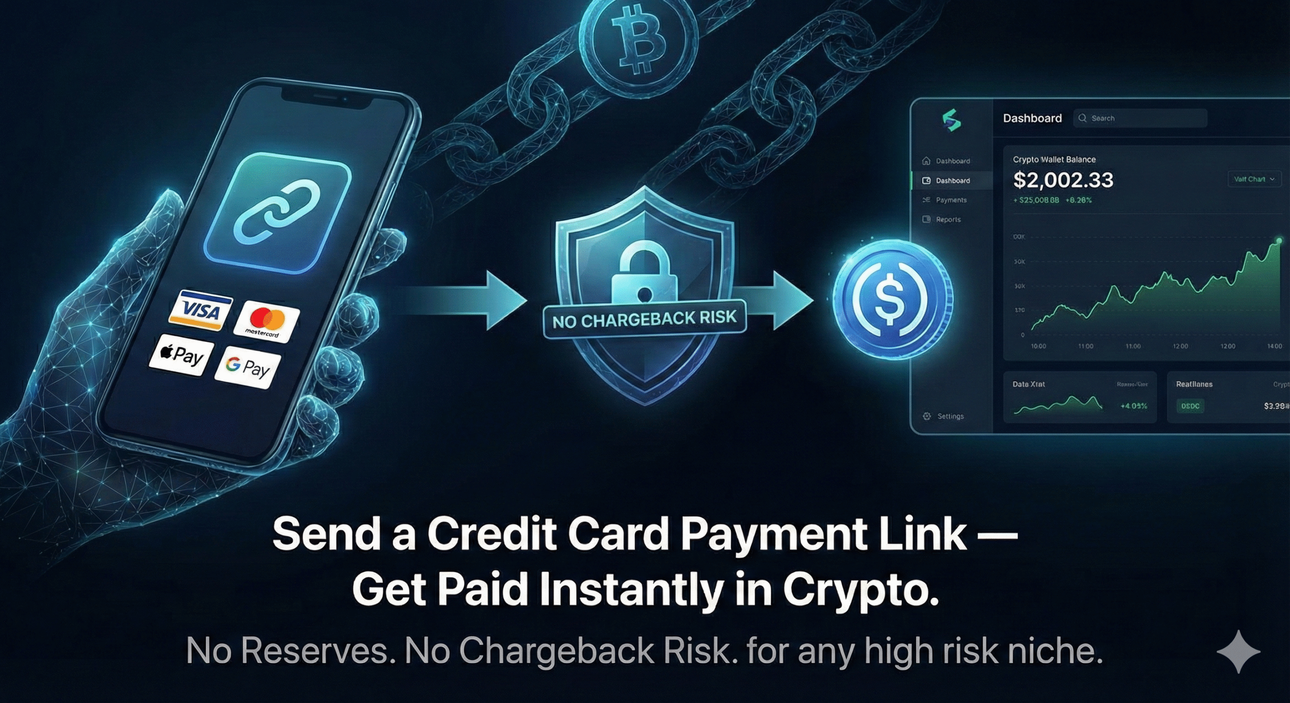 Stop losing customers to failed transactions and gateway blocks. This plugin integrates our powerful, high-risk payment gateway directly into your store. Accept major credit cards instantly and get paid in USDC crypto—with zero chargeback risk.